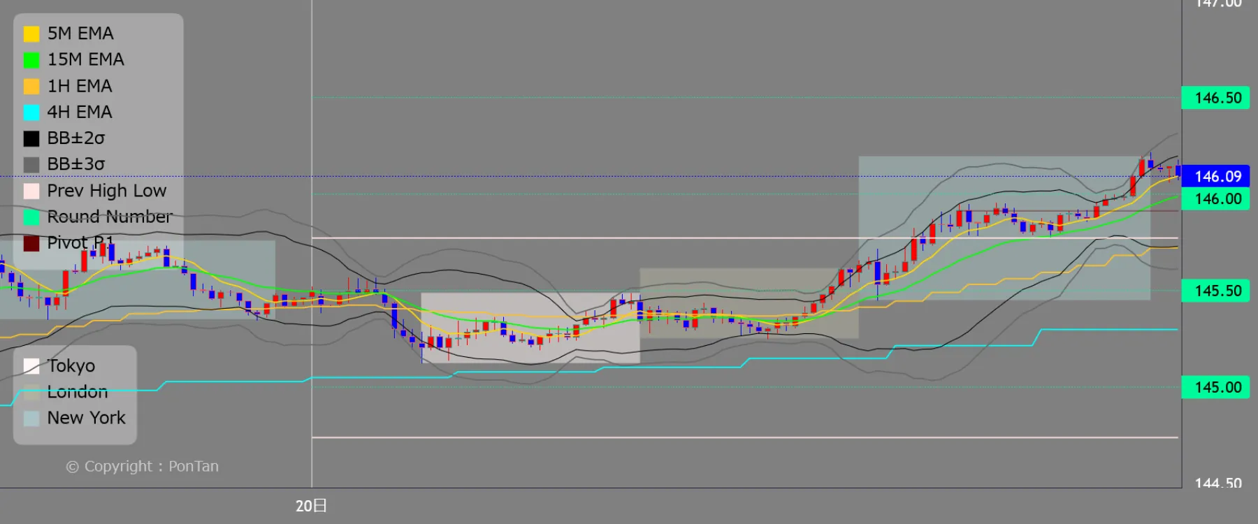 El gráfico PonTan muestra la evolución de los precios durante un periodo de cinco días, incluido el día registrado en el diario. Sólo se muestra el gráfico de 15 minutos. La rueda del ratón puede utilizarse para ampliar o reducir la imagen, y el desplazamiento a izquierda y derecha permite volver atrás y comprobar los movimientos de los precios en el pasado. La línea vertical indica la línea de la fecha y siempre está visible, pero la fecha de la parte inferior puede omitirse en función del factor de zoom. Los gráficos del día del diario se actualizan automáticamente cada 15 minutos. Cuando cambia la fecha, sólo la carta correspondiente al diario de ese día está sujeta a actualizaciones posteriores, mientras que las cartas de otras fechas son fijas. Su objetivo es "mantener un historial de los gráficos que ha estado consultando en tiempo real ese día".