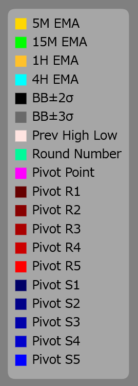 Las líneas pivote (S1-S5 / R1-R5) y el número redondo sólo aparecen en el gráfico cuando se alcanza el precio.